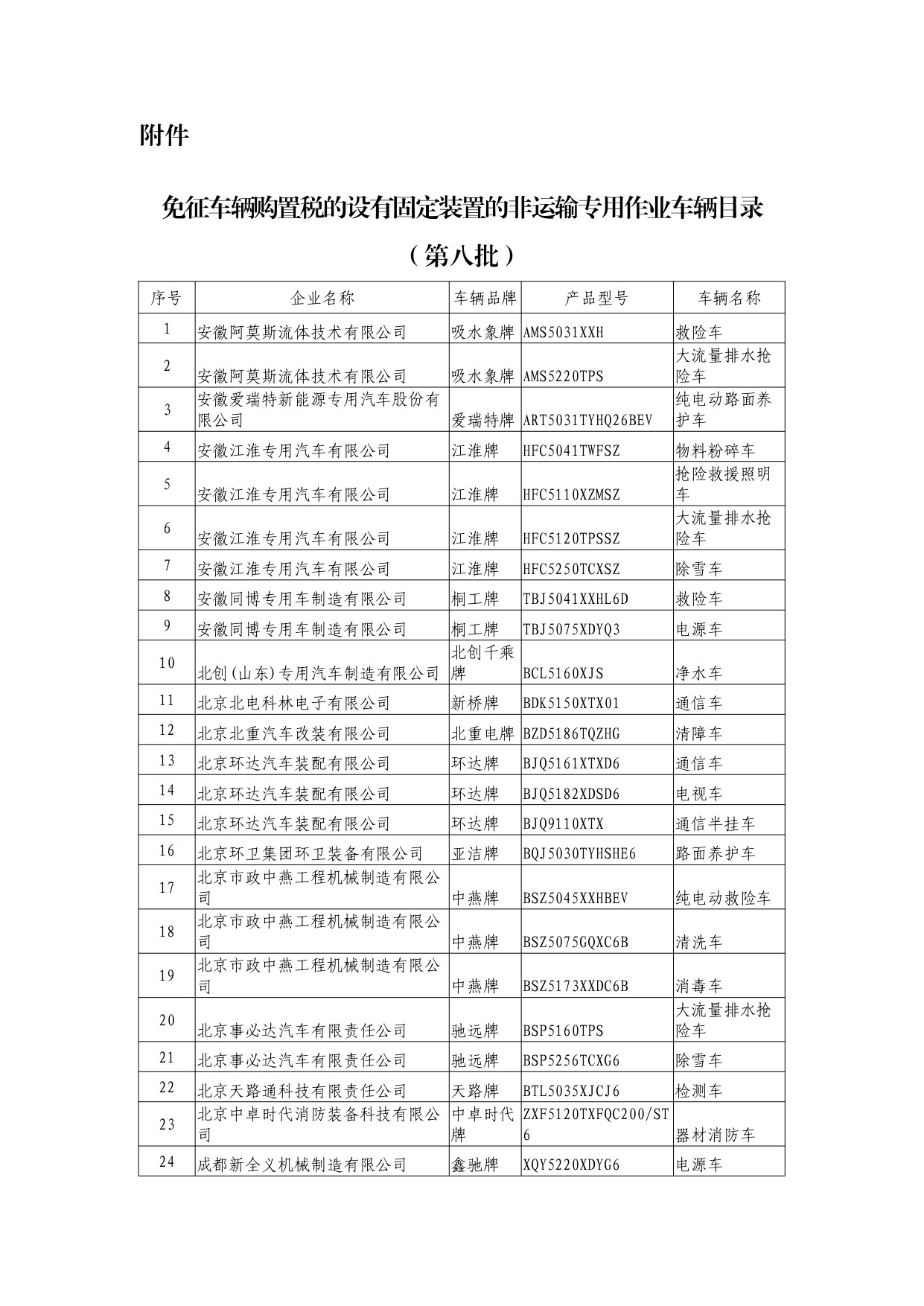 关于发布《免征车辆购置税的设有固定装置的非运输专用作业车辆目录》(第八批)的公告